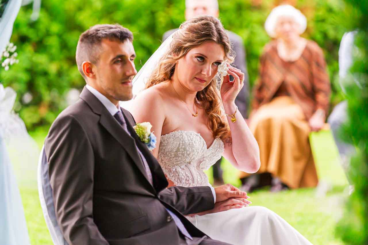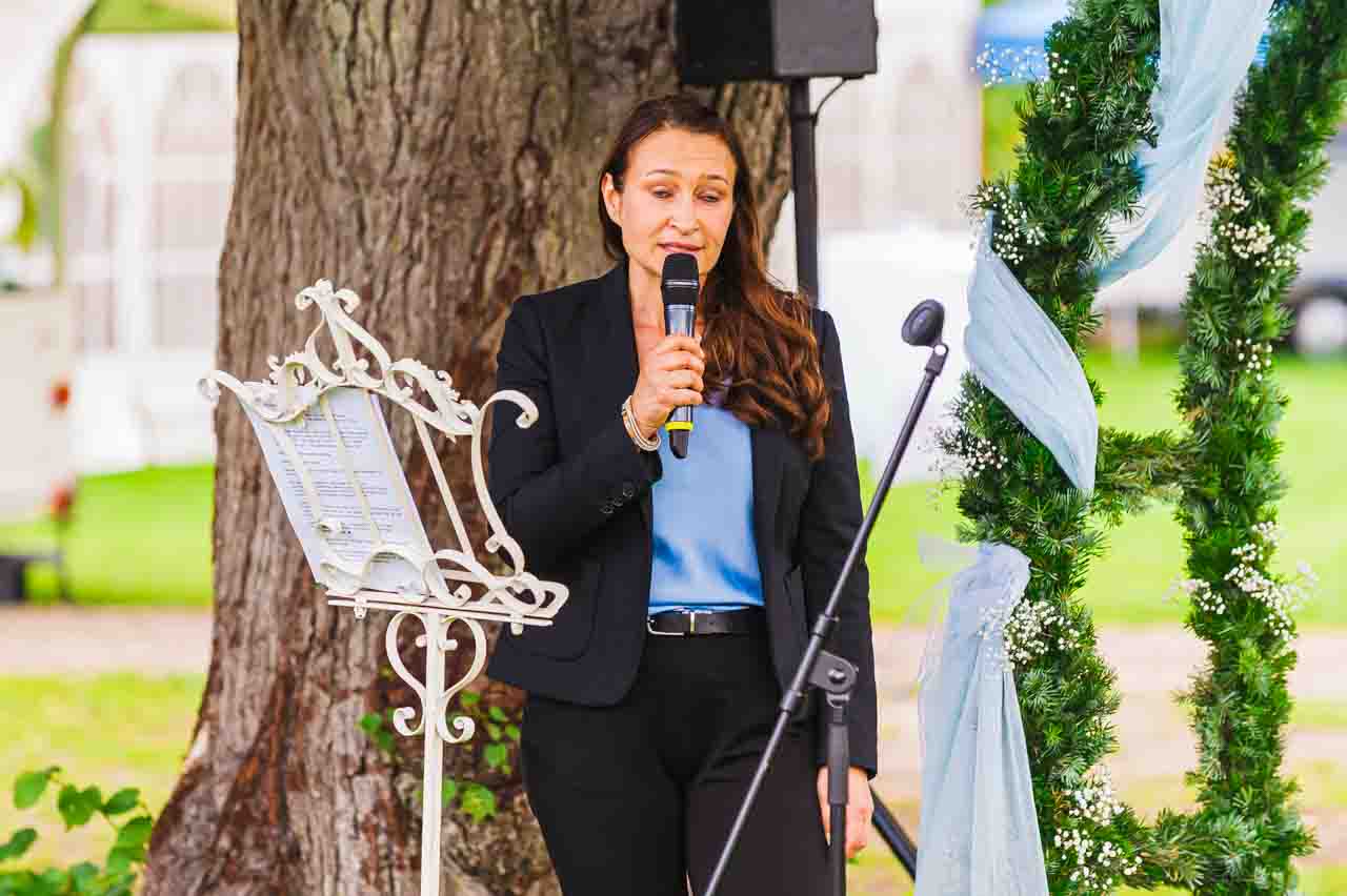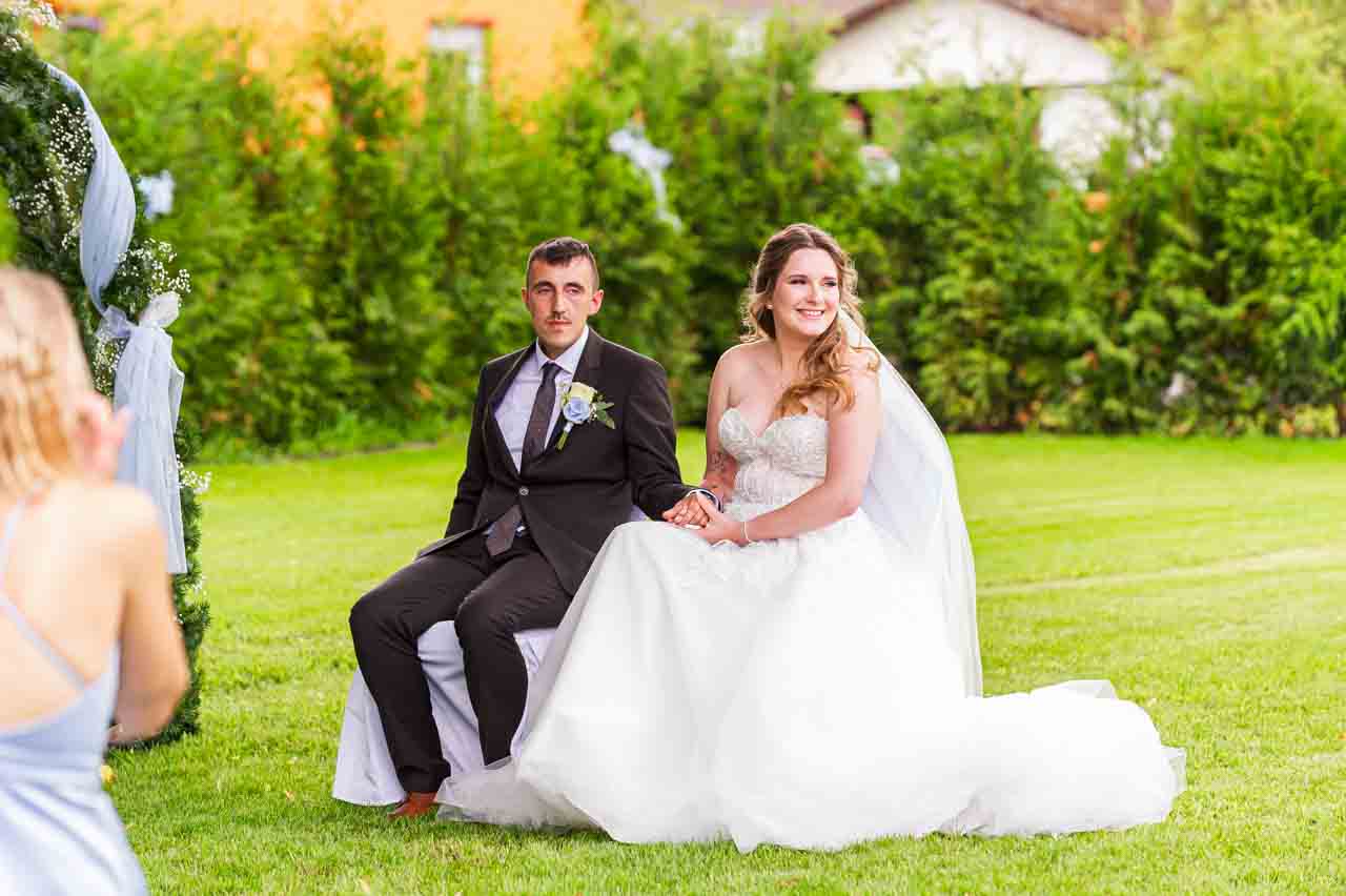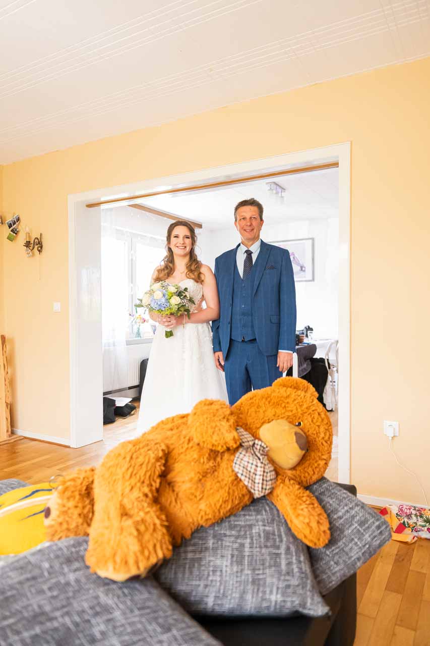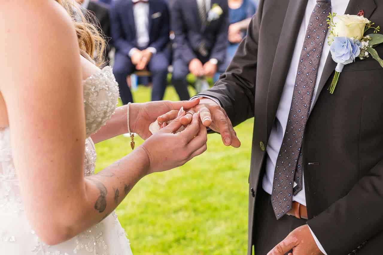Der absolute Höhepunkt der Zeremonie war ein Moment, der jedem im Gedächtnis bleiben wird. Hanna ist seit ihrer Kindheit eine leidenschaftliche Reiterin und ihr treuer Begleiter Merlin ist ein Teil der Familie. Anstatt eines traditionellen Ringkissens hatten sich die beiden etwas Einzigartiges überlegt. Als die Traurednerin nach den Ringen fragte ertönte leise Musik und eine Freundin führte den herausgeputzten Merlin zur Zeremonie. An einem mit Blumen geschmückten Band um den Oberkörper war ein kleines, verziertes Beutelchen befestigt, in dem sicher die Eheringe lagen.