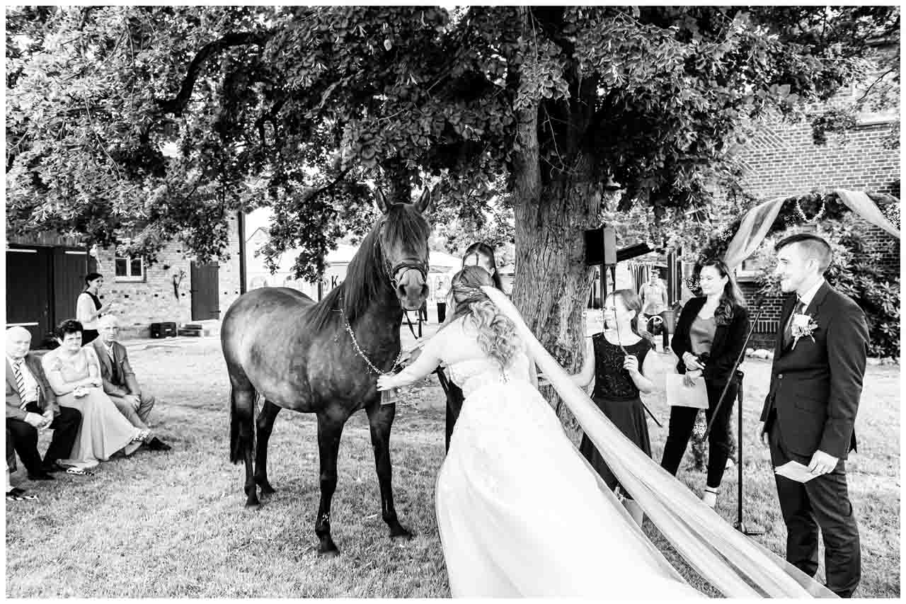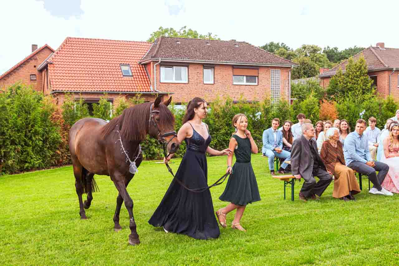 Der Moment als das Pferd die Ringe zur Trauung brachte war pure Magie. Es war ein Symbol für Vertrauen, die Verbindung zur Natur und die Einbeziehung dessen was dem Brautpaar am Herzen liegt. Ein unvergesslicher Gänsehautmoment der beweist, wie persönlich und einzigartig eine Hochzeit in Uelzen sein kann.