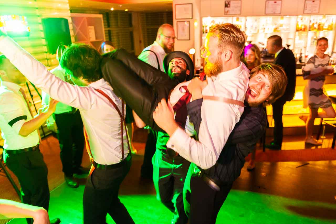- Ausgelassene Hochzeitsfeier: Freunde heben den Braeutigam in die Luft, umgeben von festlicher Stimmung und lustigen Accessoires. Unvergessliche Momente.