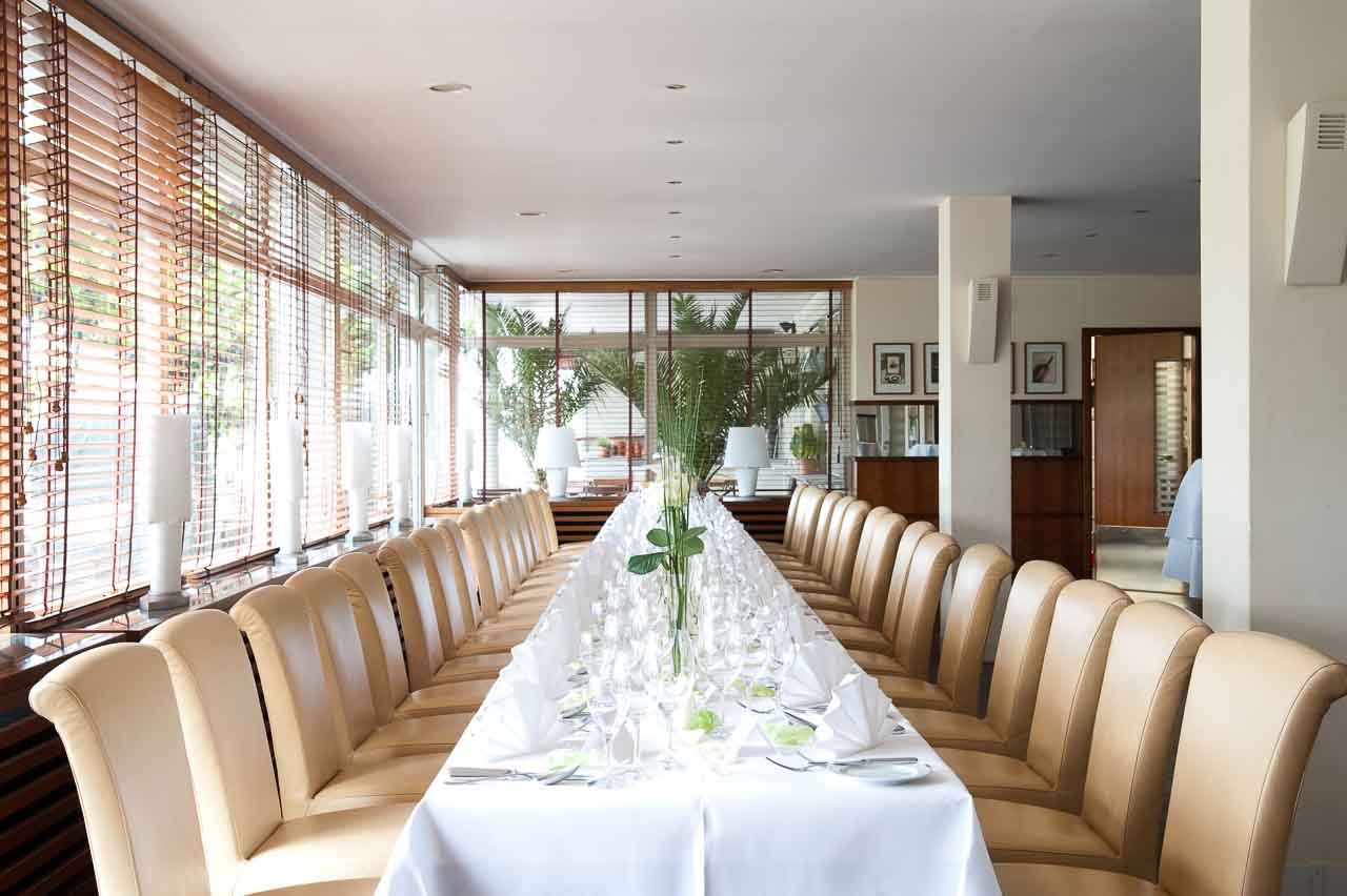 - Gemuetliches Zusammensein: Drei Herren geniessen ein entspanntes Essen in stilvoller Atmosphaere.