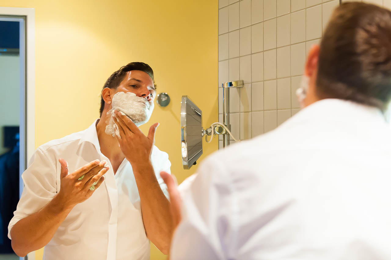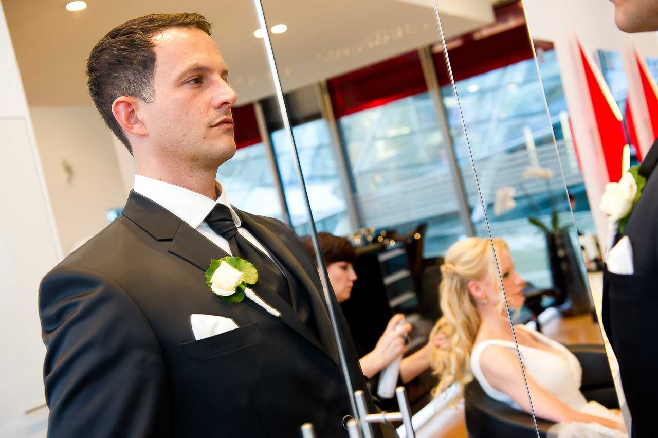 - Braeutigam im Spiegel vor der Trauung. Spannende Momente vor dem grossen Tag!